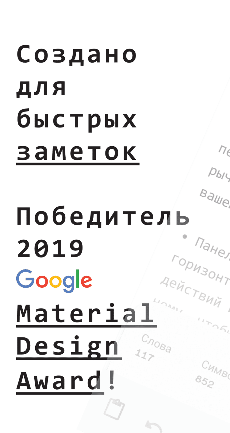 Приложение имеет очень простой, чистый интерфейс, позволяет писать тексты не отвлекаясь ни на что другое. Предлагает светлую и темную темы. Может работать на Chromebook. Идеально подходит для записи текста "на ходу".