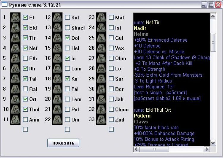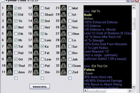 Рунные слова - это программа, которая написана для игры Diablo 2, осуществляет поиск-фильтр рунных слов (с их характеристиками) в зависимости от того какие руны у Вас есть. Включает новые рунные слова из diablo 2 1.10 , c возможностью добавления новых рунных слов самостоятельно. Полная БД уникальных и сетовых предметов c картинками каждой вещи, возможностью моментального нахождения вещей по нужным параметрам.