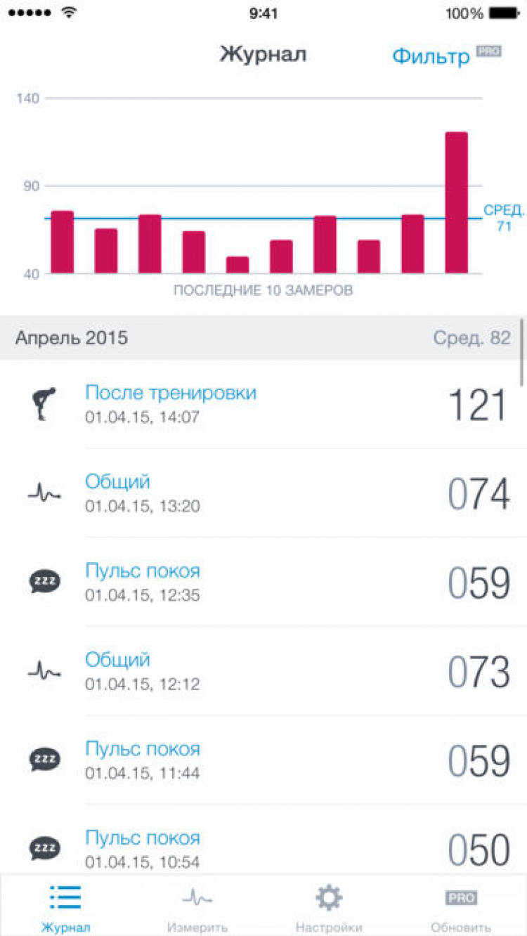 Runtastic Heart Rate Программа для измерения пульса при помощи камеры мобильного устройства. Следуйте инструкциям в программе, поднесите палец к камере устройства и приложение сделает остальное. Вы можете сохранить историю измерений и отслеживать изменения, а так же сохранять результаты на Facebook, Twitter, Google+ или отправлять по электронной почте.