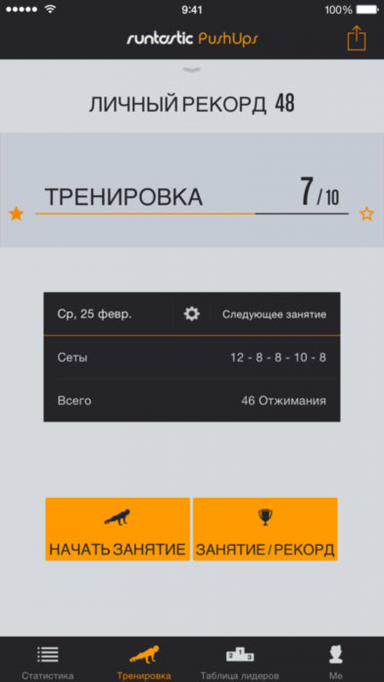 Runtastic Push-Ups PRO Программа, которая поможет вам научиться правильно отжиматься. Приложение предоставит вам наиболее эффективную программу тренировок с отжиманием и проследит за её исполнением. Программа будет считать каждый ваш жим при помощи акселерометра вашего мобильного устройства. Так же это приложение может давать вам голосовые советы и подсчитывать время передышки между подходами. Своими рекордами и достижениями вы можете поделиться с друзьями через Facebook, Google+, Twitter, а так же при помощи электронной почты.