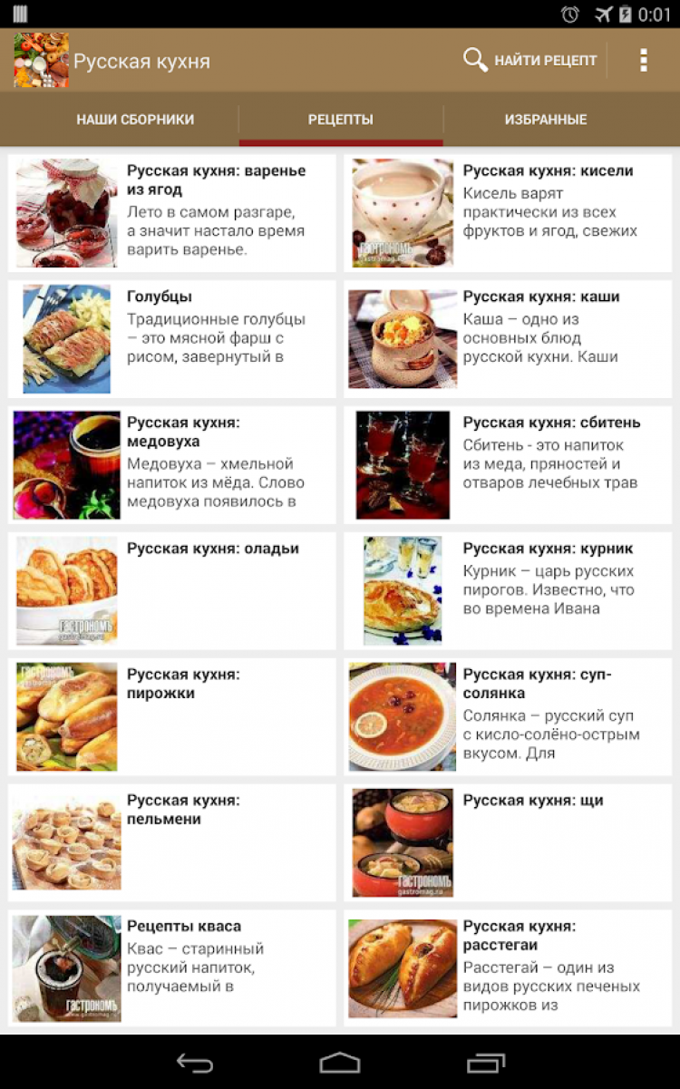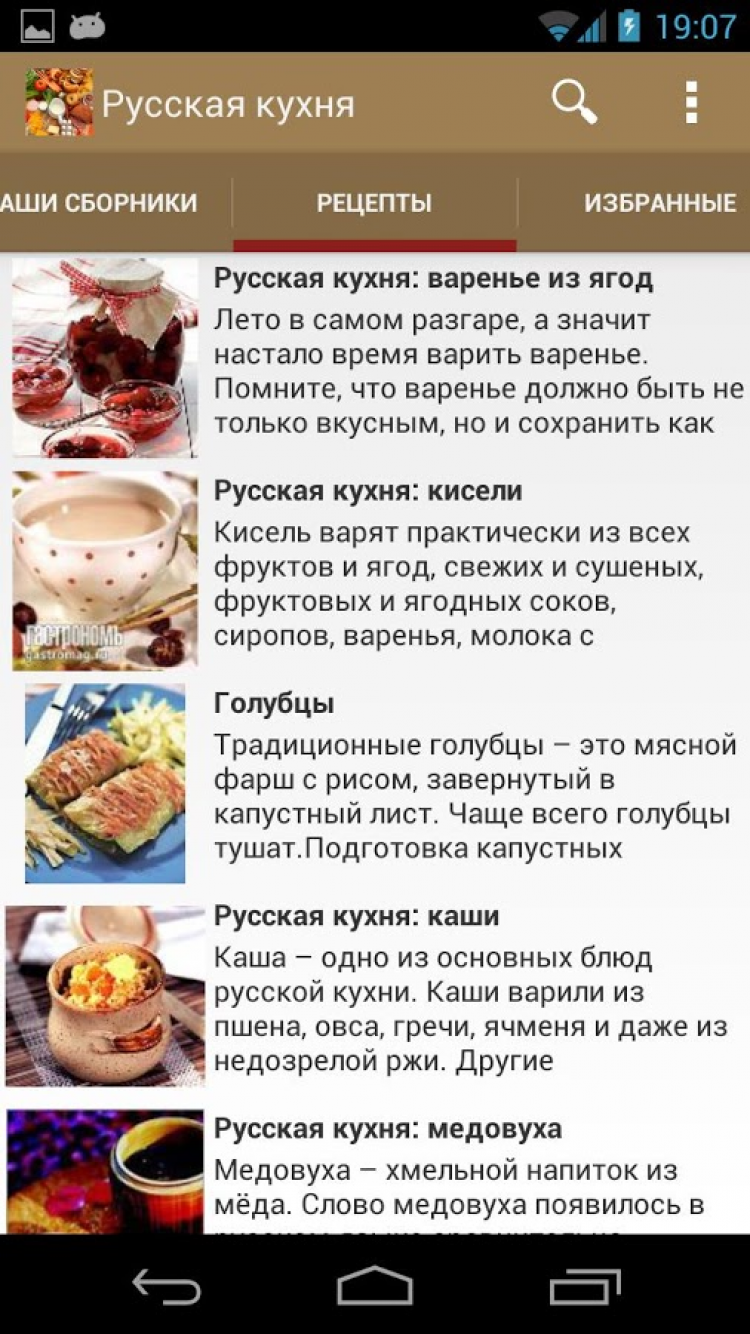 Русская кухня Приложение, содержащее большое количество рецептов русской кухни. Все рецепты с фотографиями. Понравившиеся рецепты можно добавлять в избранное и делиться ими с друзьями.