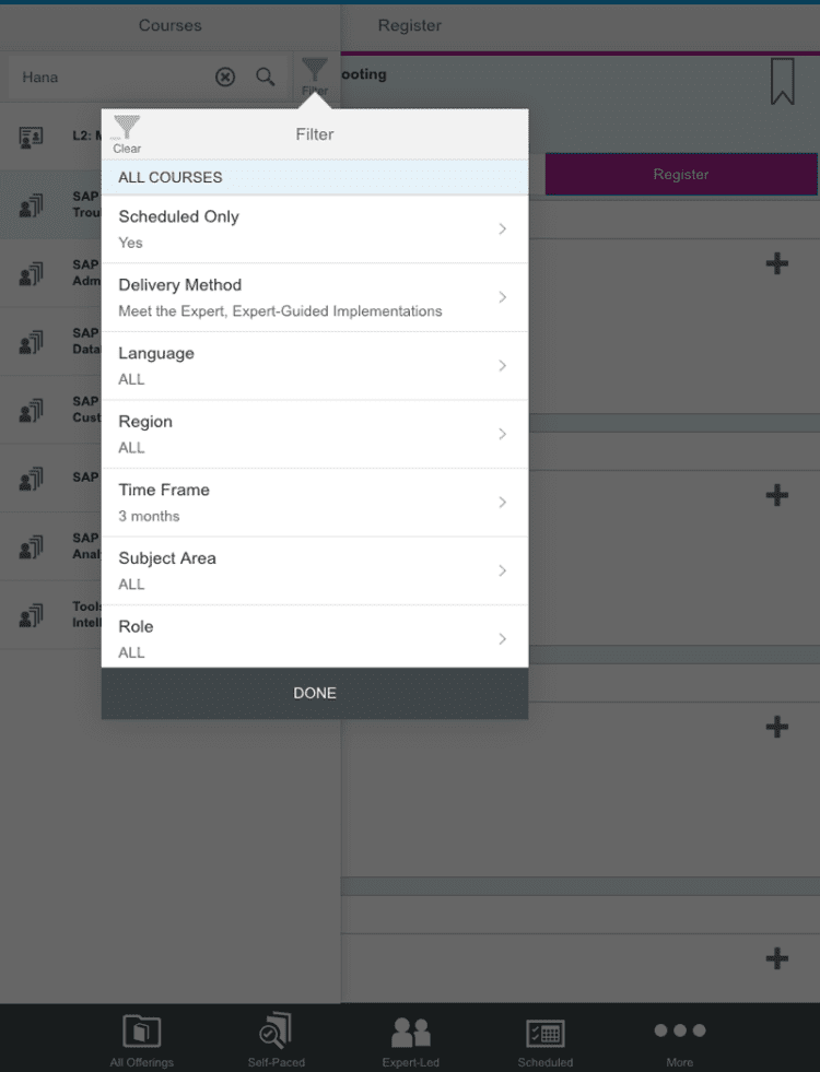 SAP Enterprise Support Academy С помощью этой программы вы сможете получить доступ к каталогу образовательных программ от SAP Enterprise Support Academy в любом месте, где бы вы ни находились. Просматривайте каталог доступных программ, детали курсов и расписание занятий, регистрироваться в семинарах, а так же многое другое.