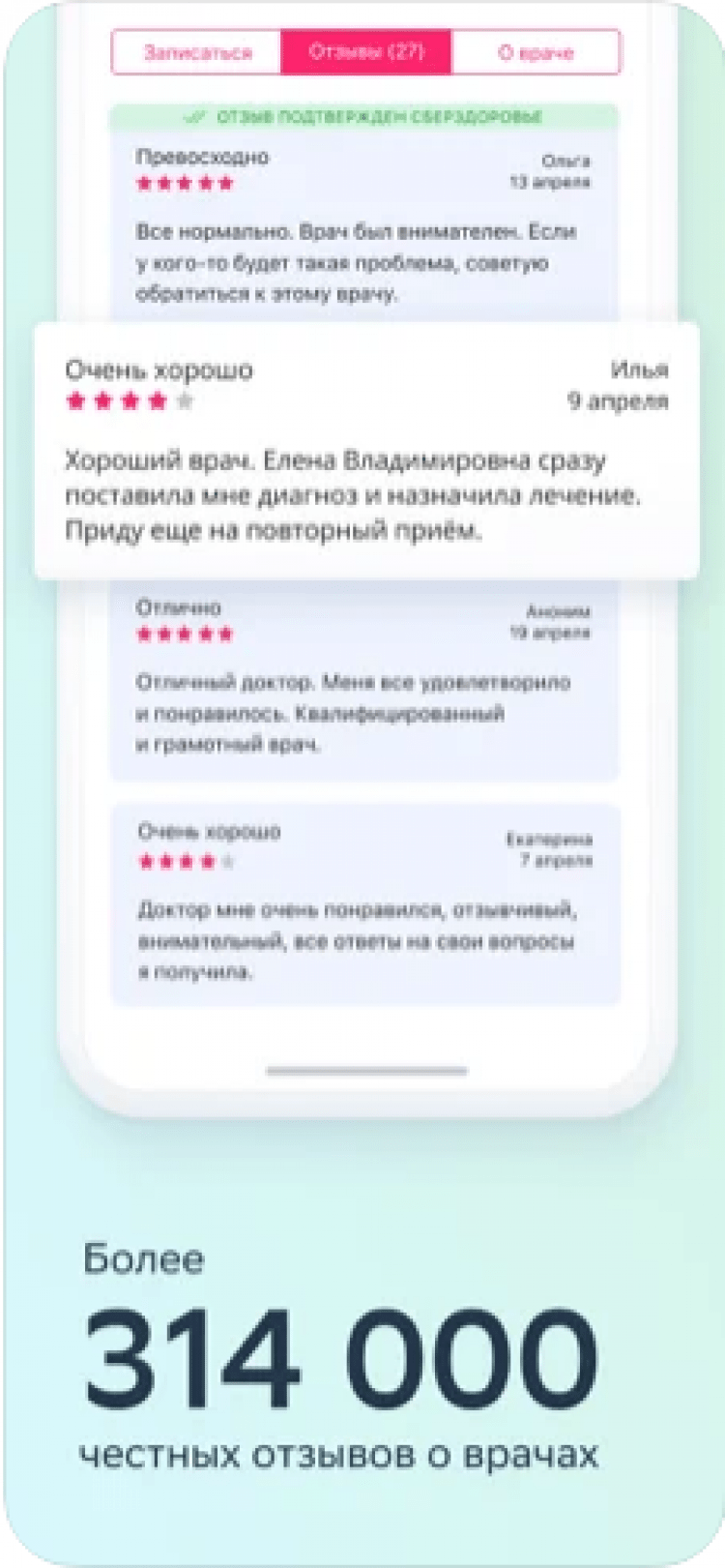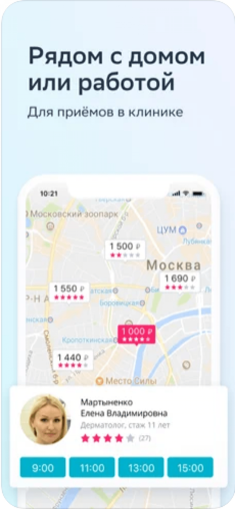 - просмотр отзывов о врачах от реальных пользователей приложения;