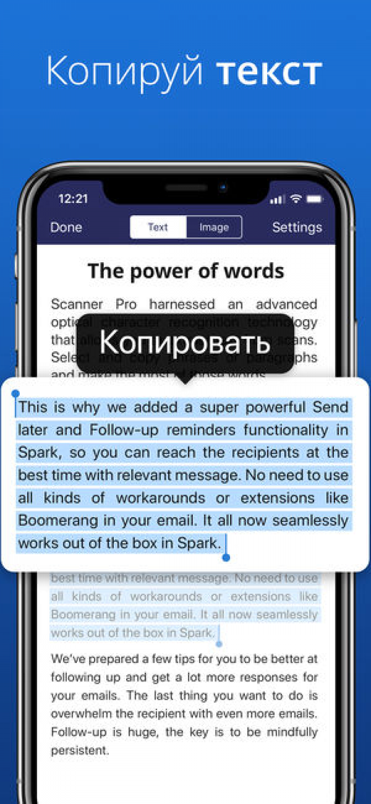 В отличие от аналогов, Scanner Pro автоматически распознаёт края документов в режиме реального времени и позволяет корректировать погрешности и исправлять угол наклона. А благодаря поддержке технологии распознавания текста (OCR), вы сможете редактировать отсканированный текст, а также копировать его отдельные части. Стоит отметить, что программа поддерживает распознавание текста на нескольких языках, среди которых русский, английский, украинский, немецкий, французский, итальянский, испанский, португальский, голландский, турецкий, польский, шведский, норвежский, японский, китайский, чешский, датский, греческий, хорватский и эстонский.