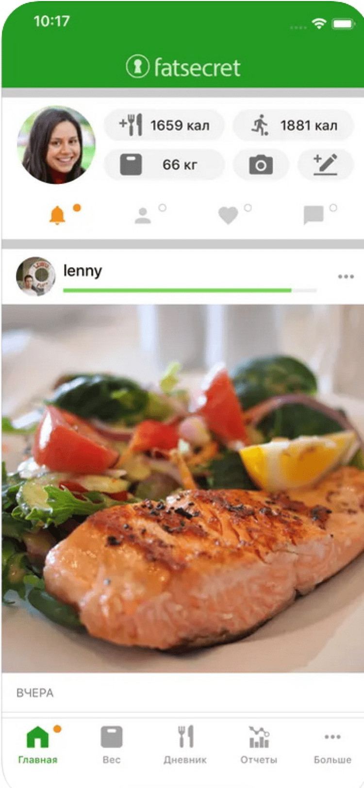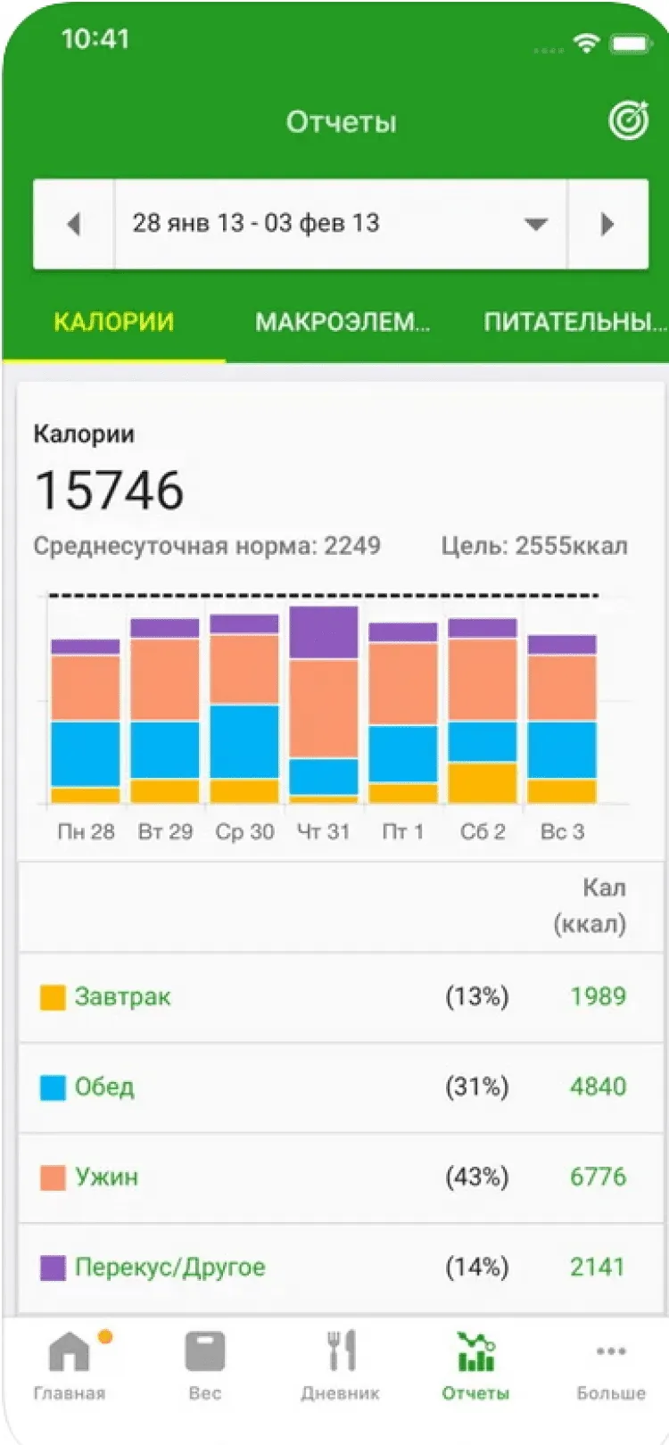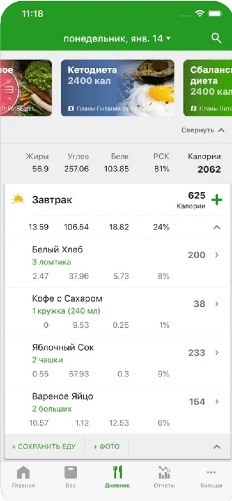 Счетчик Калорий от FatSecret Удобный счетчик калорий, который поможет следить за тем, когда и что вы съели и сколько калорий получили. С его помощью вы сможете узнавать о пищевой ценности продуктов и колличестве калорий, которые вы набрали. Так же вы сможете вести дневник физических упражнений, что бы знать сколько калорий вы сожгли. Счетчик Калорий поможет составить диету, чтобы поддерживаться ваш огранизм в хорошей форме.