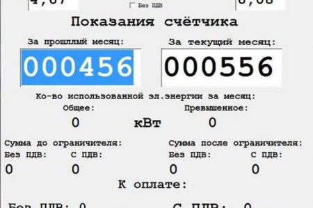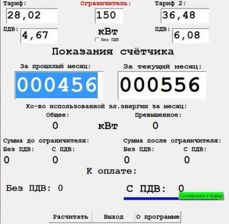 В программу введены функции расчёта с ПДВ и без ПДВ. Можно установить ограничитель, то есть определённое число кВт после которого рассчёт идёт по другому тарифу. Введены функции отключения ПДВ, а так же копирования общей суммы,общего количества киловатт, првышенного значения киловатт в буфер.То есть Вы кликаете на конечную сумму и она копируется в буфер. В любом редакторе, Блокнот, Word, Exel, и др., нажимаете Ctrl-V и вставляете конечную сумму. Вместе с программой в архиве файл в формате Exel, настроенный для наблюдения за показателями программы. Пользуйтесь на здоровье!)