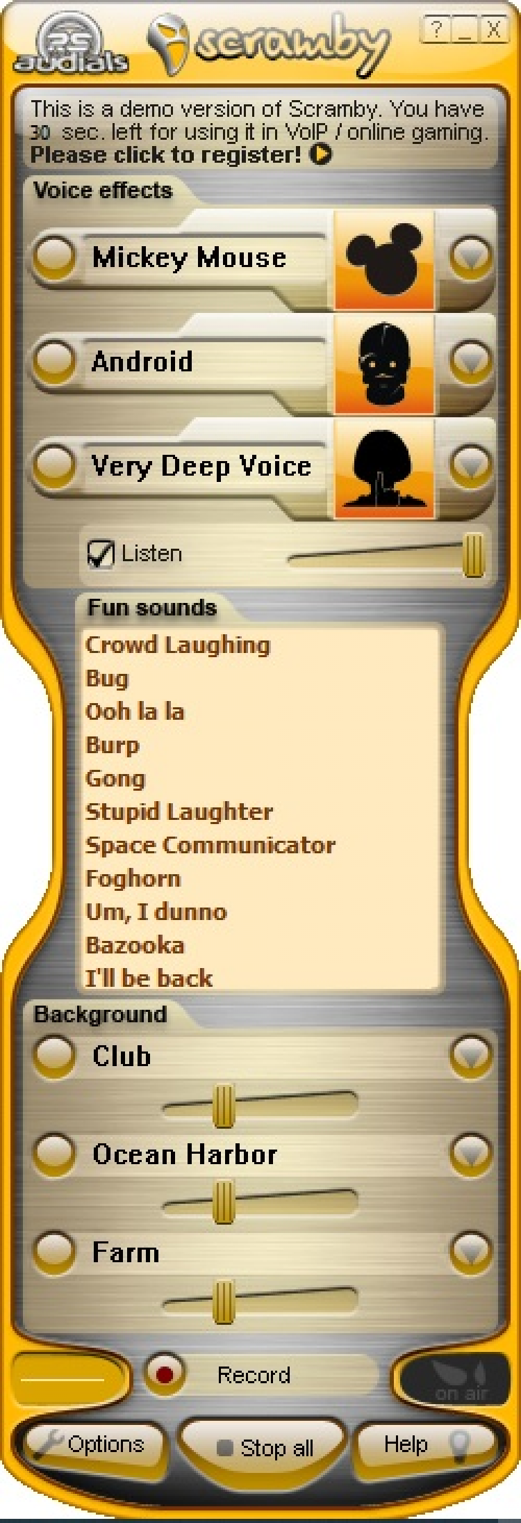 Scramby - программа для компьютеров на Windows, которая поможет до неузнаваемости изменить ваш голос на записях. Содержит около 40 встроенных эффектов и целый ряд фоновых шумов.