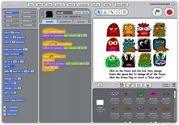 Для программирования сценариев в скретче используется drag-and-drop-подход: блоки из Окна блоков перетаскиваются в область скриптов. У многих блоков имеется редактируемое белое поле для вводимых скретч-программистом параметров.