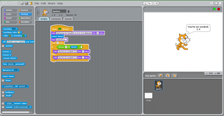 Для программирования сценариев в скретче используется drag-and-drop-подход: блоки из Окна блоков перетаскиваются в область скриптов. У многих блоков имеется редактируемое белое поле для вводимых скретч-программистом параметров.