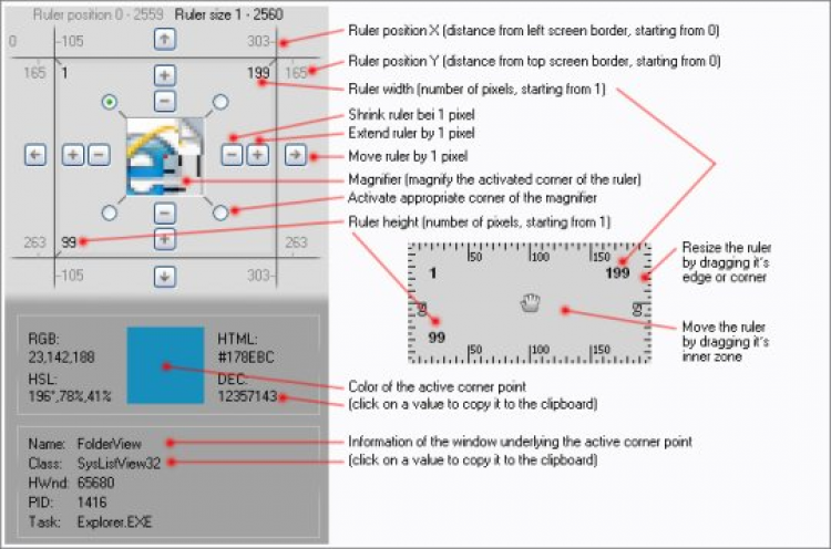 Screen Ruler 2D - это инструмент для точного измерения объектов на экране компьютера. Позволяет измерять объекты по вертикали и горизонтали с точностью до пикселей. Кроме того, Screen Ruler 2D обладает встроенной цветовой палитрой, которая показывает значения цвета под курсором мыши в разных системах.