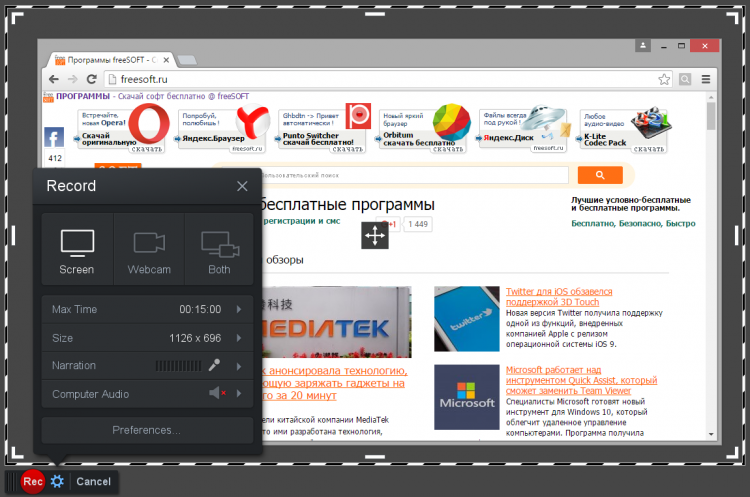 Screencast-O-Matic позволяет вести параллельную запись видео с подключенной веб-камеры и звук с микрофона, что позволяет комментировать происходящее на экране, добавлять пояснения и пр.