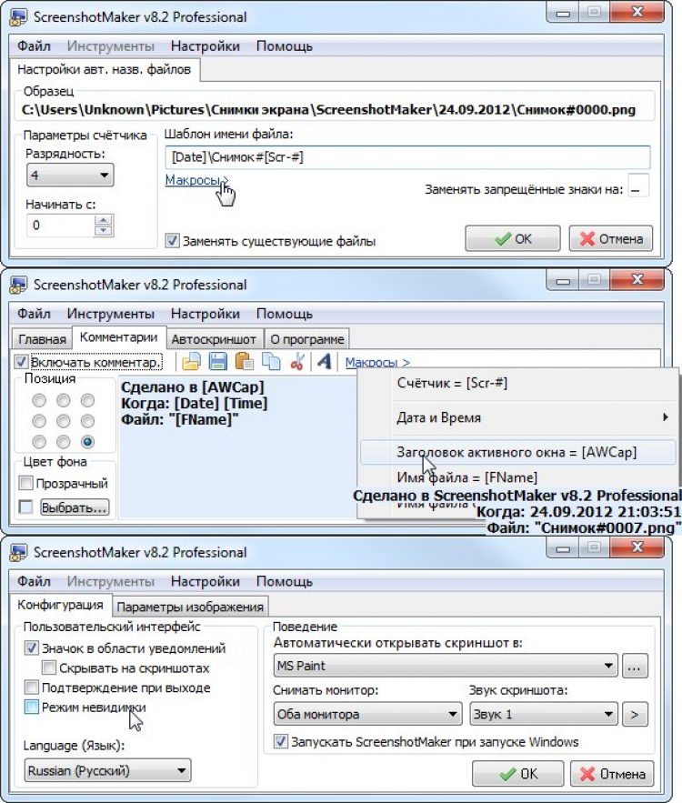 - автоматическое наименование файлов и папок для скриншотов с тонкой настройкой с использованием макросов;