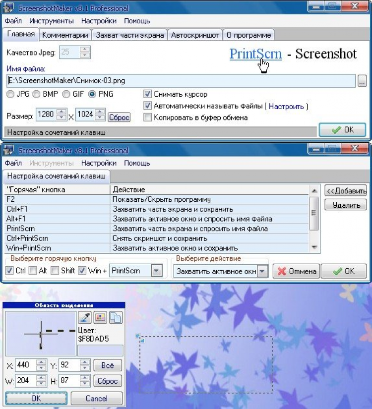 ScreenshotMaker - это программа для создания скриншотов экрана, активного окна или фрагмента экрана с последующим сохранением их в форматах .png, .jpg, .gif или .bmp в выбранную пользователем директорию.