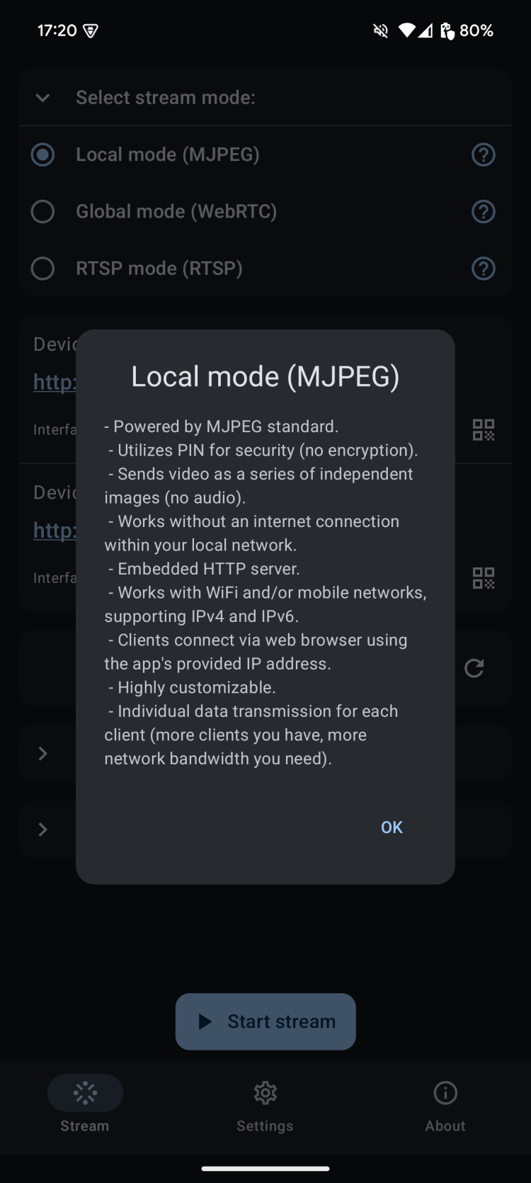- Локальный (MJPEG). Использует встроенный HTTP-сервер и не требует доступа к Интернету. Подходит для потоковой передачи видео в виде независимых изображений JPEG. Не имеет шифрования и не может передавать звук.