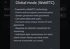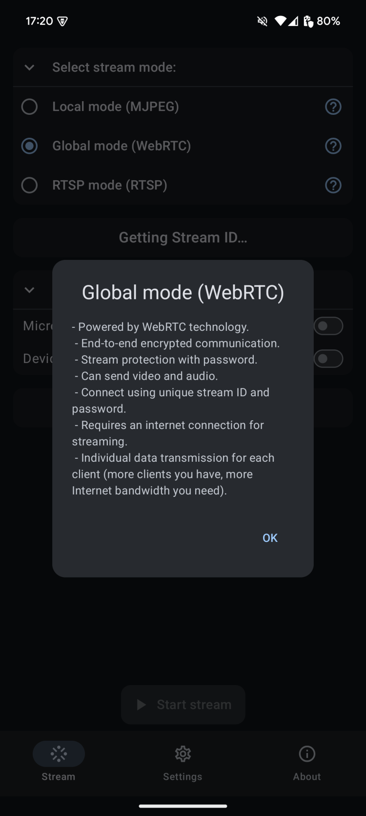 - Глобальный (WebRTC). Это режим потоковой передачи, защищенный сквозным шифрованием, который позволяет делиться изображением с экрана, звуком с устройства и с микрофона. Гостям необходимо использовать браузер с поддержкой WebRTC и ввести идентификатор трансляции и пароль, для доступа к трансляции.