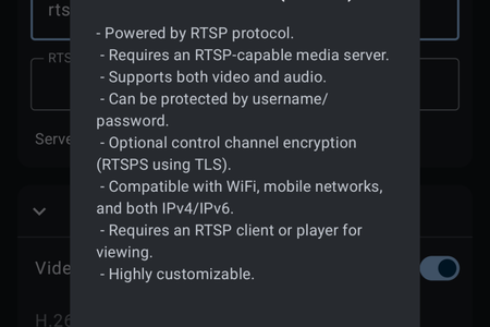 - RTSP. Для этого режима требуется сервер с поддержкой RTSP. Подходит для потоковой передачи видео H.265/H.264/AV1 и звука OPUS/AAC/G.711 по Wi-Fi или сотовой сети.