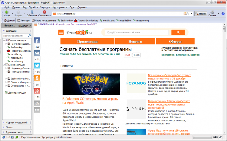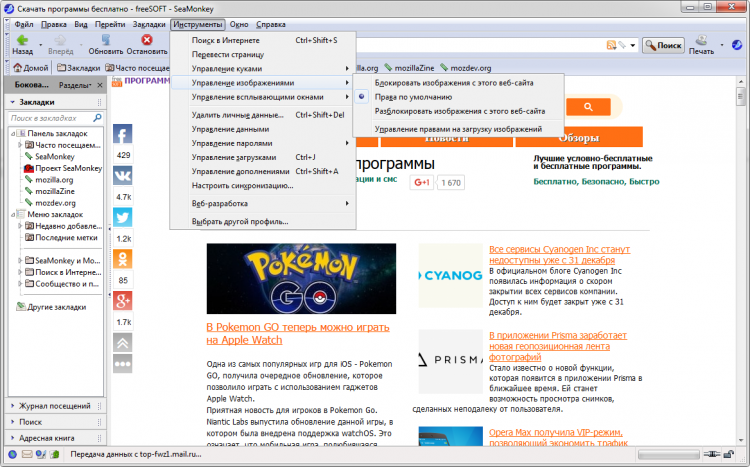 В добавок к этому браузер может проверять сохраненные cookie и удалять потенциально опасные и нежелательные, блокировать изображения на некоторых веб-сайтах для ускорения их загрузки, добавлять закладки и многое другое. А через удобную боковую панель (Вид - Показать/скрыть) можно получить быстрый доступ к закладкам, журналу посещений, поиску и адресной книге.