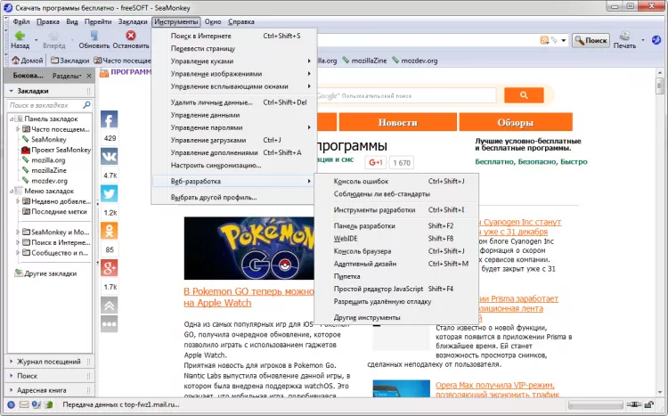 SeaMonkey - это набор программ с открытым исходным кодом, который включает в себя веб-браузер, почтовый клиент с функцией RSS-агрегатора и HTML-редактора, IRC-чат, а также ряд инструментов веб-разработчика. В основу программ из этого набор лег исходный код всем известных Mozilla Firefox и Thunderbird, поэтому они обладают схожим функционалом и возможностям.