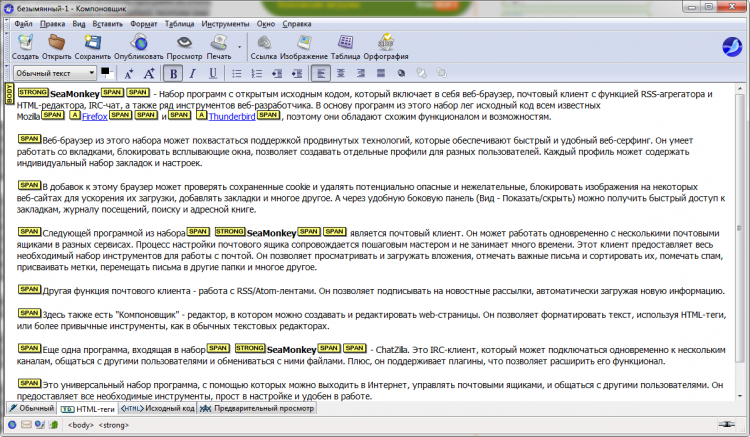 Здесь также есть "Компоновщик" - редактор, в котором можно создавать и редактировать web-страницы. Он позволяет форматировать текст, используя HTML-теги, или более привычные инструменты, как в обычных текстовых редакторах.