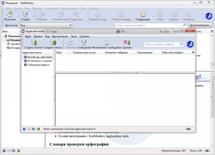 Следующей программой из набора SeaMonkey является почтовый клиент. Он может работать одновременно с несколькими почтовыми ящиками в разных сервисах. Процесс настройки почтового ящика сопровождается пошаговым мастером и не занимает много времени. Этот клиент предоставляет весь необходимый набор инструментов для работы с почтой. Он позволяет просматривать и загружать вложения, отмечать важные письма и сортировать их, помечать спам, присваивать метки, перемещать письма в другие папки и многое другое.