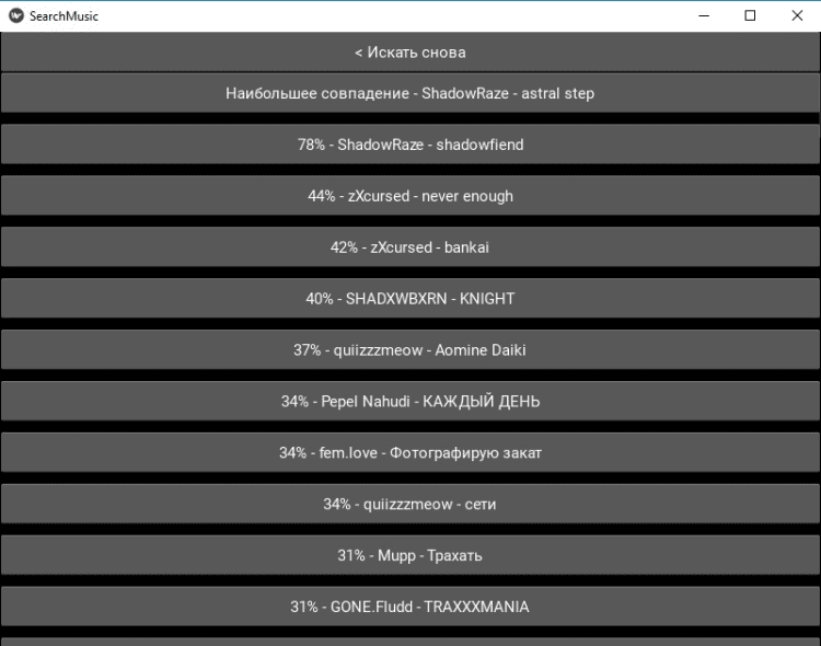 Простое приложение, demo-версия с минимальным функционалом. Позволяет подбирать ту музыку, которая похожа на выбранную вами. Поиск ведется по списку музыки и исполнителей ВКонтакте. Имеется возможность поиска не только похожей музыки, но и исполнителей.