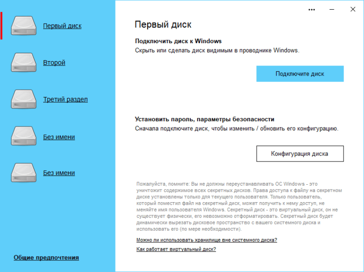Secret Disk защищает виртуальный диск паролем. В заблокированном состоянии диск невидим как для пользователей, так и для системы. При выключении или перезагрузке компьютера диск автоматически скрывается.