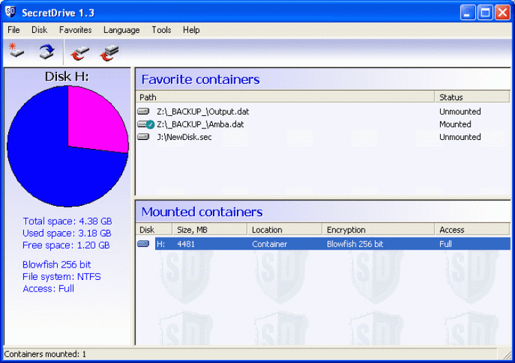 SecretDrive позволяет создавать и использовать одновременно до 8 виртуальных дисков. Каждый диск может быть защищен одним из 5 современных алгоритмов шифрования (по выбору). Поддерживается шифрование файлов. Алгоритмы шифрования: AES (Rijndael),GOST 28174-89,Blowfish,Twofish,CAST 256.