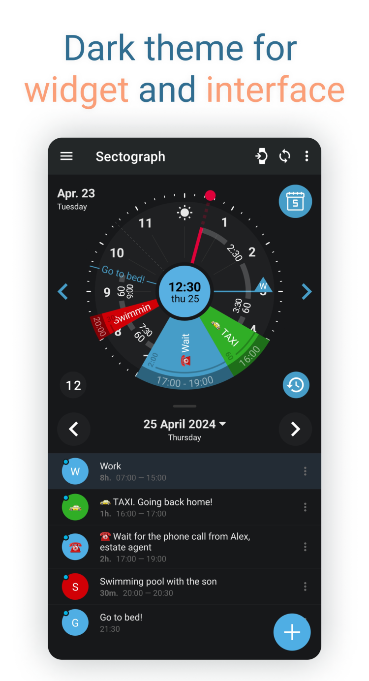 Вы ищете надежный и простой в использовании планировщик времени? Тогда попробуйте Sectograph. Это единственный в своем роде визуальный планировщик времени для Android, который преобразует ваше расписание в интуитивную 12-часовую круговую диаграмму. Это программное обеспечение предлагает новый подход к управлению временем, помогая вам видеть свое расписание на циферблате аналоговых часов. Вместо времени, эта версия "часов" покажет вам список предстоящих событий. Каждый сегмент на циферблате соответствует запланированному делу, встрече или совещанию, указывая начало и продолжительность каждой задачи. Таким образом, вы можете проверить список задач на день одним взглядом на экран смартфона.