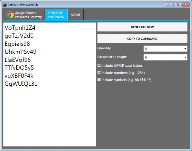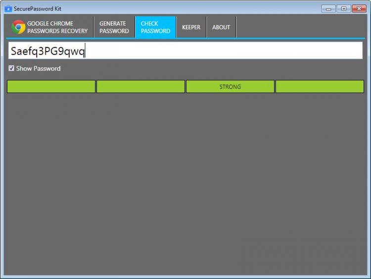 SecurePassword Kit – это набор инструментов для работы с паролями. Первая версия программы предлагает генератор паролей с опциями, позволяющими менять сложность создаваемых паролей и востановление паролей, сохраненных браузером Google Chrome.