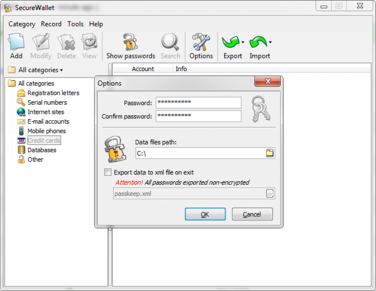 По умолчанию программа предлагает набор готовых, но можно создать новые. В зависимости от типа записи, программа предлагает заполнить различные поля, например, имя, название веб-сайта, серийный номер, номер телефона, почтовый адрес, URL-ссылка и пр. Само собой, все записи можно редактировать в любой момент. Что касается защиты данных, то SecureWallet использует для этого пароль, который можно установить в настройках программы. Она также имеет функцию экспорта данных в .xml, .csv или .txt файлы. Однако следует учитывать, что экспортированные файлы уже не являются защищенными. В общем и целом, данная программа является неплохим решением задачи безопасного хранения личных данных, будь то логины от социальных сетей, или данные банковской карты. Скачайте SecureWallet с goida-soft.ru!