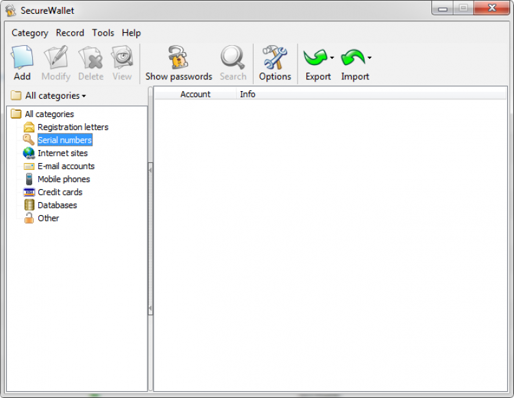 SecureWallet - это программа, которая поможет решить проблему упорядоченного и защищенного хранения персональных данных таких, как логины и пароли от веб-сайтов, номера и пин-коды банковских карт, и любые другие данные. Программой легко и удобно пользоваться. Во многом благодаря простому интерфейсу, через который можно создавать новые и управлять старыми записями. SecureWallet позволяет четко организовать все записи, распределяя их по категориям.