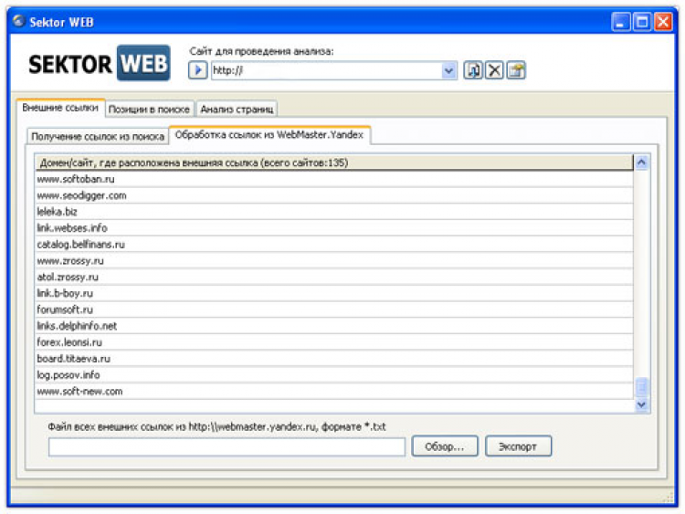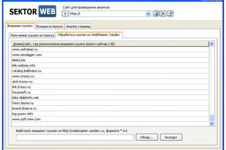 - Экспорт списка внешних ссылок, формирование "белых" списков, отсев неэффективных ссылок.