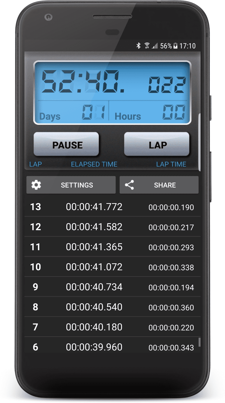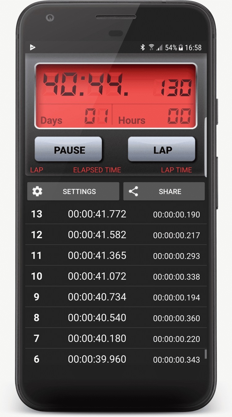 - возможность поставить секундомер на паузу;