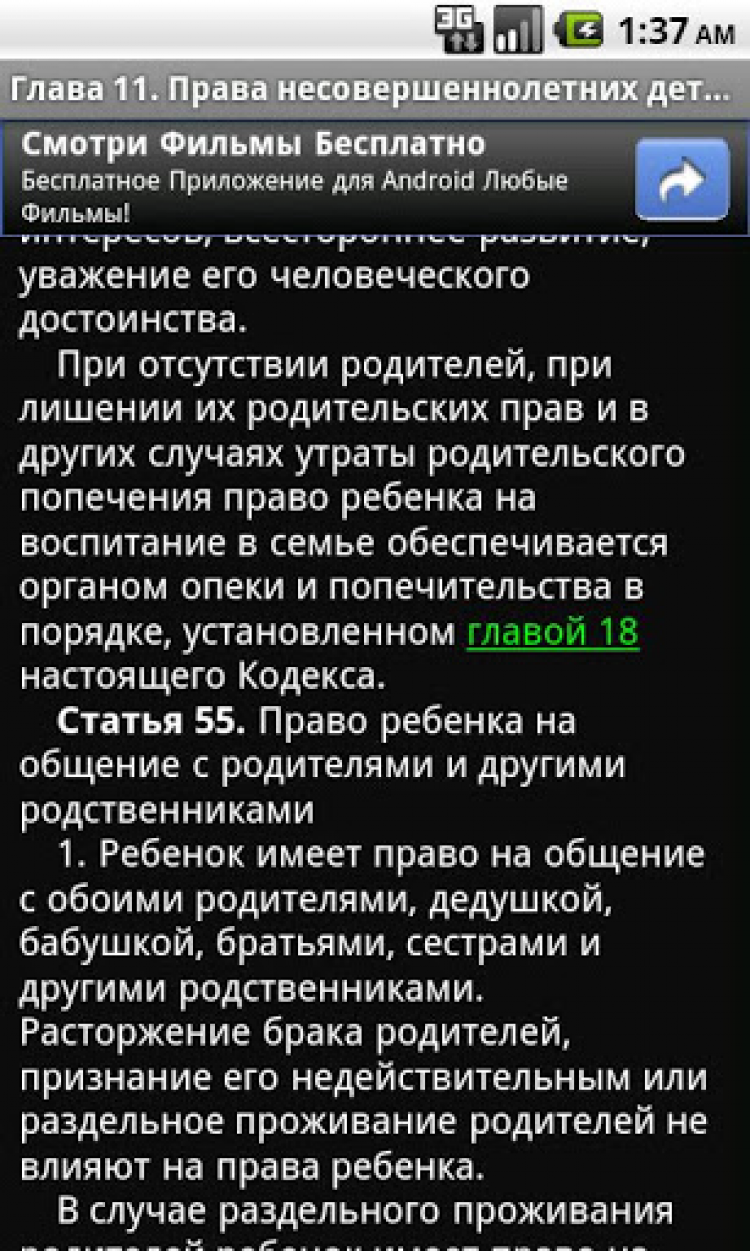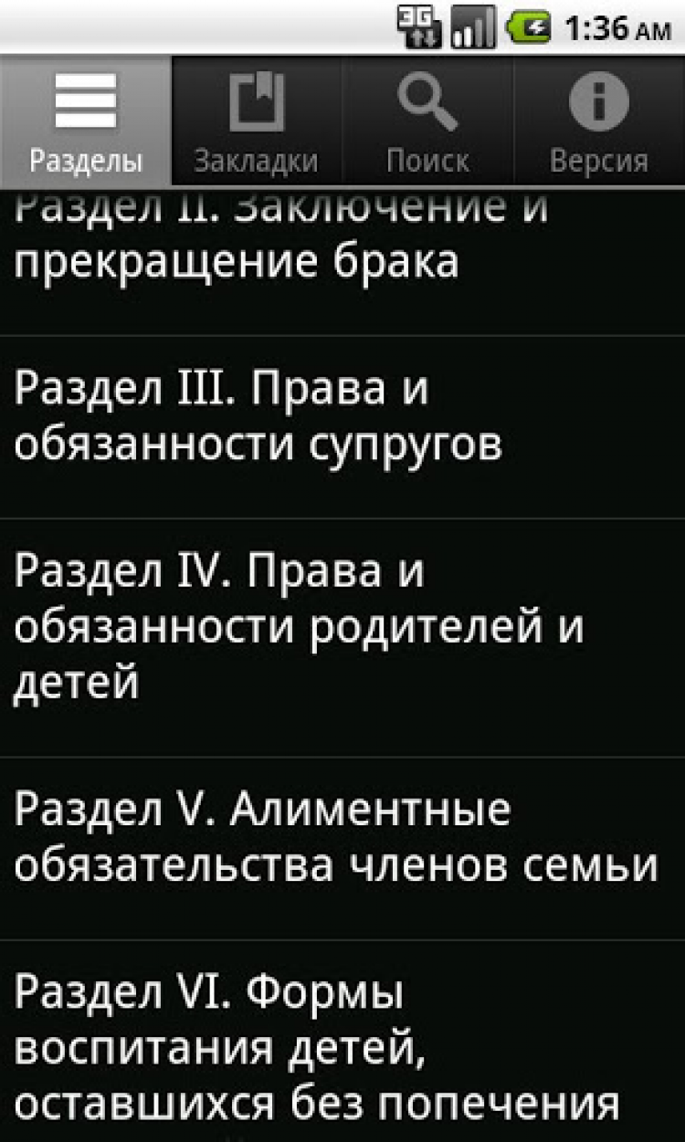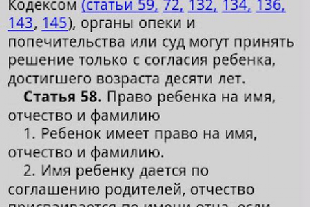 Семейный кодекс РФ Приложение содержит последнюю (действующую) версию Семейного кодекса РФ. Приложение поддерживает навигацию по статьям (можно переходить от одной статье к другой по ссылкам и возвращаться обратно). Необходимые статьи и абзацы можно отмечать закладками (чтобы всегда иметь возможность быстро открыть нужный раздел). В настройках может быть установлен светлый или темный фон, а также размер шрифта. Поддерживается поиск.