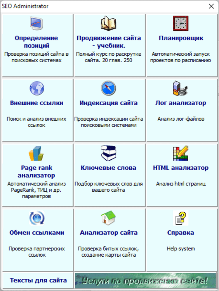 Semonitor — это программа для раскрутки и оптимизации сайта в поисковых системах. Позволяет проверять позиции и индексацию сайта, работать с внешними ссылками, подбирать ключевые слова и много другое. Автоматическое определение инедкса цитирования Яндекс и Google PageRank, расчет уровня конкуренции по ключевым словам.