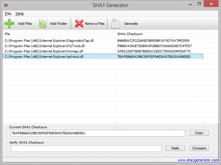 SHA1 Generator - это простой в использовании генератор контрольной суммы. Используя SHA1 Generator, можно быстро получить контрольную сумму одного или нескольких файлов, которую можно скопировать в буфер или сравнить с оригинальным значением для проверки целостности файла.