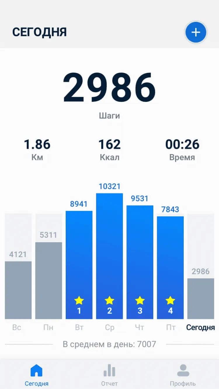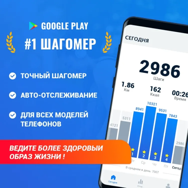 Шагомер — бесплатный счетчик шагов и калорий станет вашим надежным помощником во время пеших прогулок. Благодаря этой программе, вы сможете устанавливать ежедневные цели и просматривать свою персональную статистику, при помощи наглядных диаграмм. В последней версии программы, вы найдёте статистику по сожженным калориям, пройденному расстоянию, продолжительности прогулки