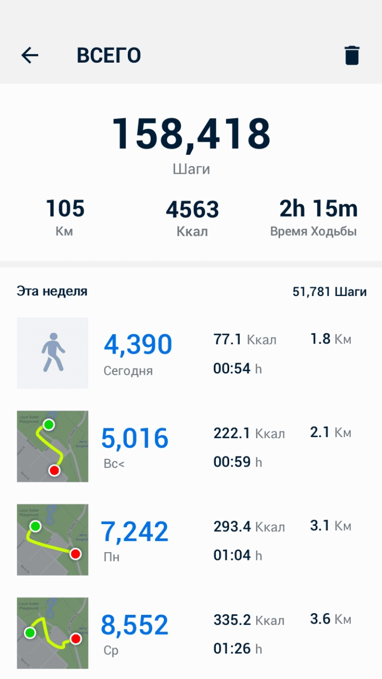 - начало подсчета шагов в один тап;