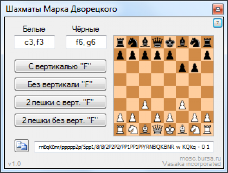 Шахматы Марка Дворецкого - это современные шахматы перегружены дебютной теорией настолько, что в подготовке гроссмейстера около 90%, это работа дома над дебютом и только 10% это непосредственная работа за доской. Назрела проблема. Как сделать, чтобы заучивание дебютов стало бесполезной тратой времени? Чтобы шахматист играл своим умом, а не анализом, разработанным дома? Заслуженный тренер СССР, Марк Израилевич Дворецкий предложил достаточно простое и элегантное решение этой проблемы, которое реализовано в данном программном продукте: "Берём обычную начальную позицию. Делаем белыми и черными по жребию по ходу пешкой вперед на одну клетку (причем ходы - не обязательно симметричные), а уж затем начинаем играть".