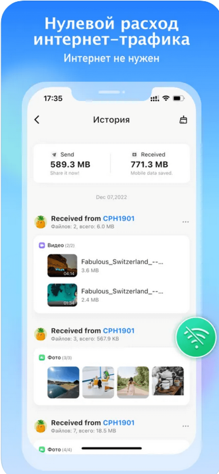 Отправлять можно совершенно любые типы файлов: фотографии, видео, аудио, документы, контакты и многое другое. Передача не расходует интернет трафик и осуществляется совершенно бесплатно. Единственным требованием для передачи данных является нахождение устройств с установленной программой SHAREit (Шареит) в зоне видимости друг друга.