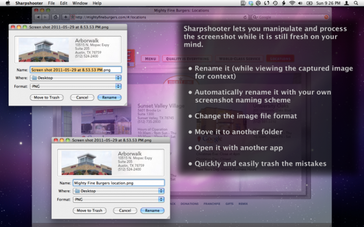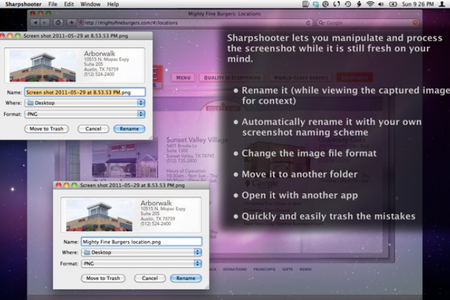 Sharpshooter Программа, которая облегчит вам управление скриншотами на вашем Mac. Каждый раз, когда вы будете снимать скриншот, программа будет отображать диалоговое окно, в котором вы сможете выбрать дальнейшее действие. В числе доступных действий - удаление в корзину, переименовывание и сохранение.
