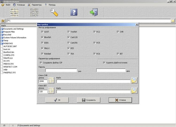 - шифрование и дешифрование файлов по методу GOST, Blowfish, IDEA, Misty1, Rijndael, Twofish, Cast128, Cast256, RC2, RC5, RC6, DES, TEA по паролю;
