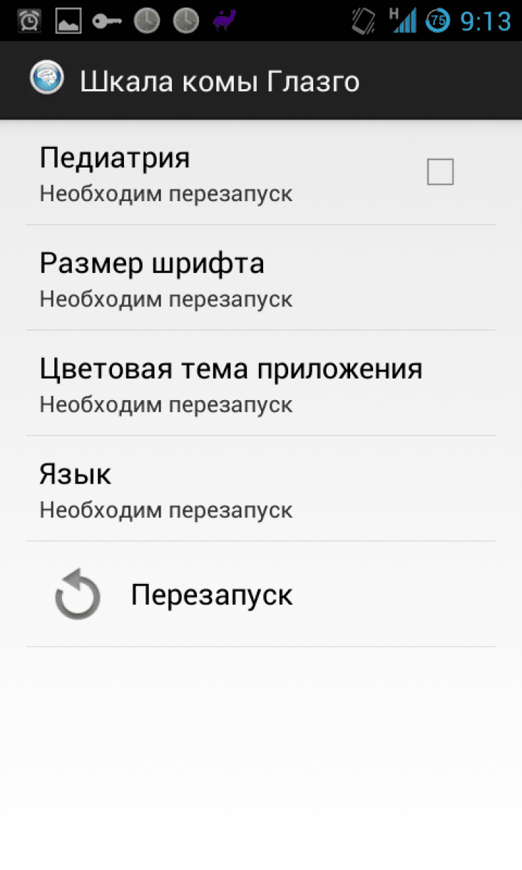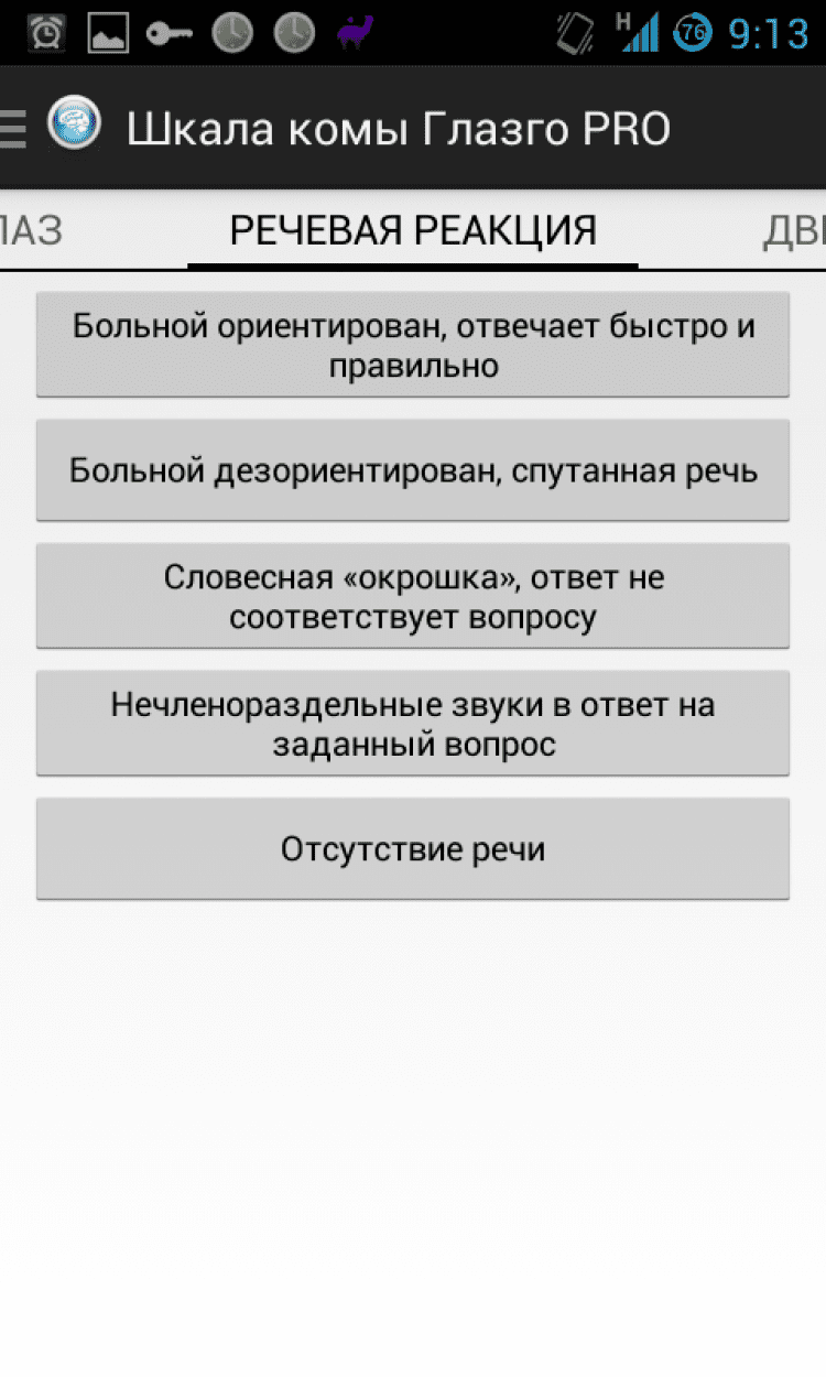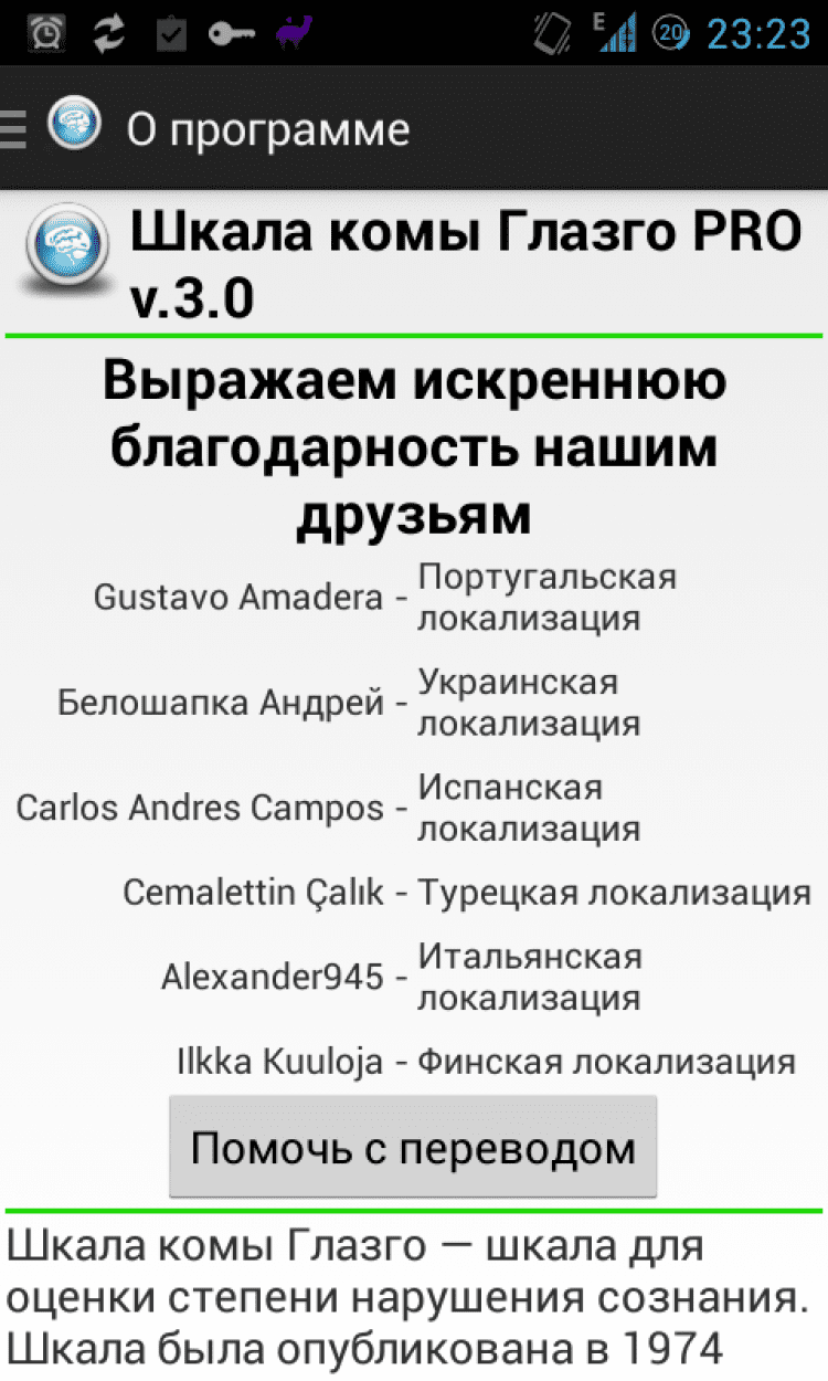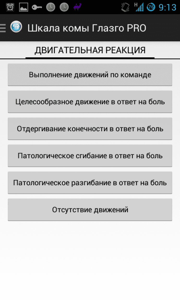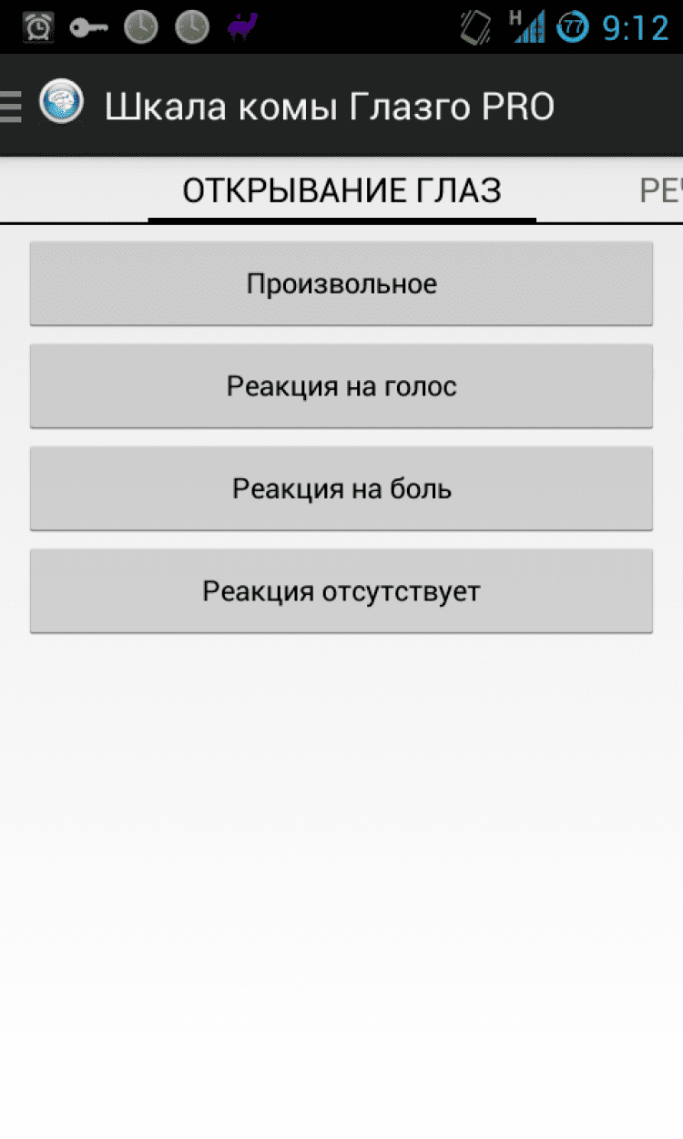 Шкала комы Глазго Оценка уровня сознания по шкале комы Глазго в 3 касания. Программу отличает отсутствие рекламы, минимальный размер приложения. Ничего лишнего. Корректная поддержка устройств с различными размерами экрана (в том числе планшетов).