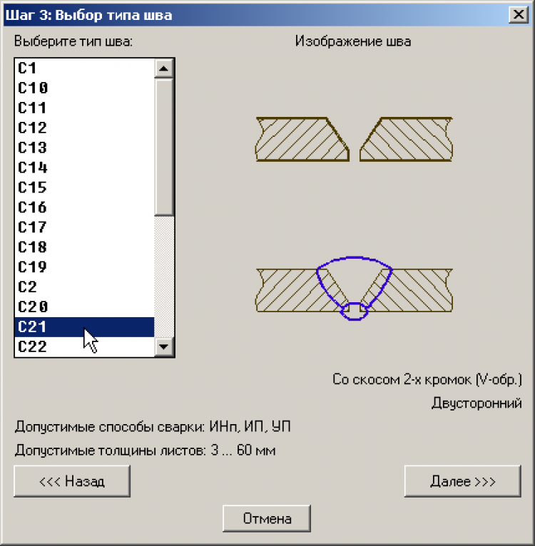 А в нижней части этого окна отображаются допустимые способы сварки и допускимые толщины листов для выбранного типа шва. В следующем диалоговом окне Пользователю предлагается ввести конкретные параметры выбранного шва. В первую очередь нужно выбрать способ сварки. От него будут зависеть все остальные параметры (у некоторых типов швов способ сварки, согласно ГОСТу, может быть только один, поэтому выбирать нечего). Также можно нажать на кнопку "О способах" и посмотреть расшифровку способов сварки. После выбора способа ниже в окне отображаются параметры Smin, Smax – это минимальная и максимальная толщина листов для данного способа сварки.