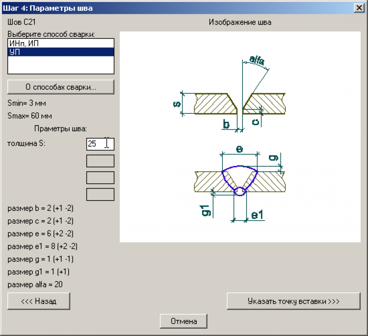 Далее нужно указать параметры шва, которые зависят от пользователя: в большинстве случаев, это только S – толщина листа. Иногда добавляются (в зависимости от шва) еще кое-какие параметры. Все параметры, которые зависят от пользователя, будет предложено ввести. Все зависимые параметры шва (те параметры, которые определяются ГОСТом), программа подбирает автоматически и выводит Вам в нижнем списке диалогового окна (размер е, g, b, c, угол alfa…). После того, как Пользователь указал все требуемые параметры, следует нажать на кнопку «Указать точку вставки».