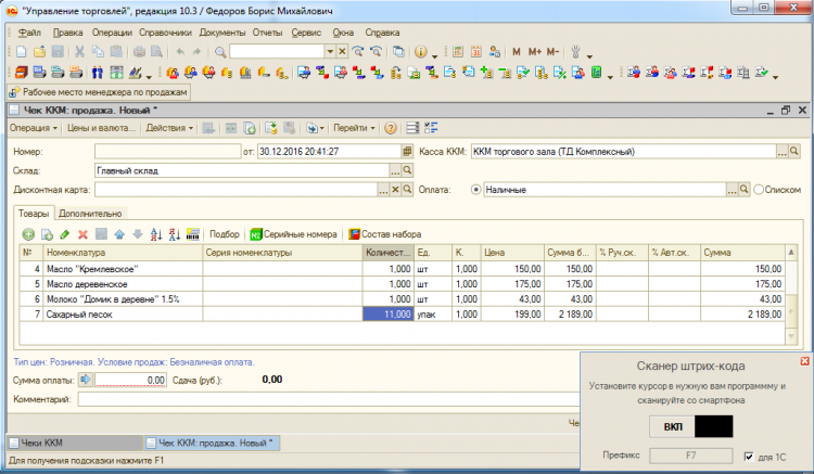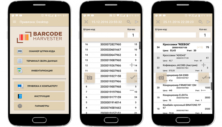 Считывать штрих коды можно как камерой телефона, так и подключенным по USB сканером штрих-кода (максимальное быстродействие), или же ручным вводом, с удобным поиском.