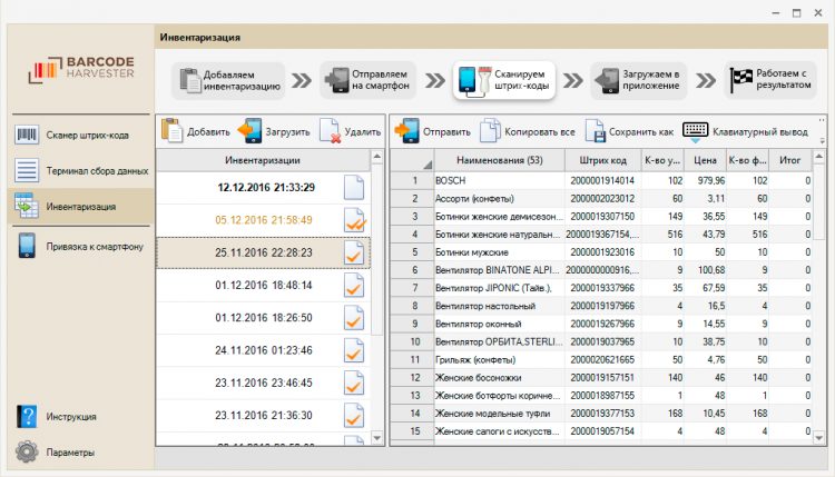 В этом режиме, вы одним «копировать/вставить» создаете «заготовку», с наименованиями номенклатуры, штрих-кодами, учетным количеством, и если нужно ценами. Отправляете «заготовку» на телефон, телефоном считываете штрих-коды, контролируя наименования, количество и цены. После наполнения отправляете документ обратно в компьютер и выводите «фактические» данные в вашу учетную программу, удобным для вас способом.