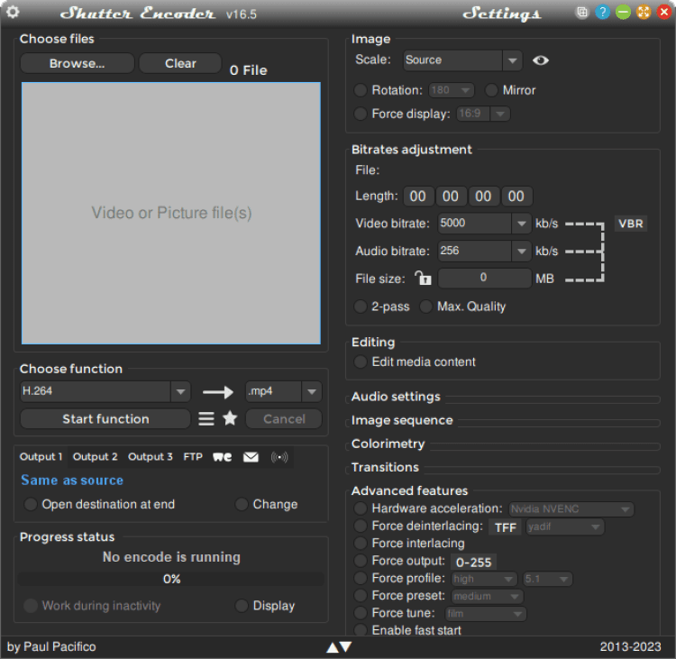 Shutter Encoder - это продвинутый видео конвертер, использующий FFmpeg кодировщик, который обеспечивает поддержку всех возможных кодеков. Кроме видео он так же работает с изображениями и аудио файлами.