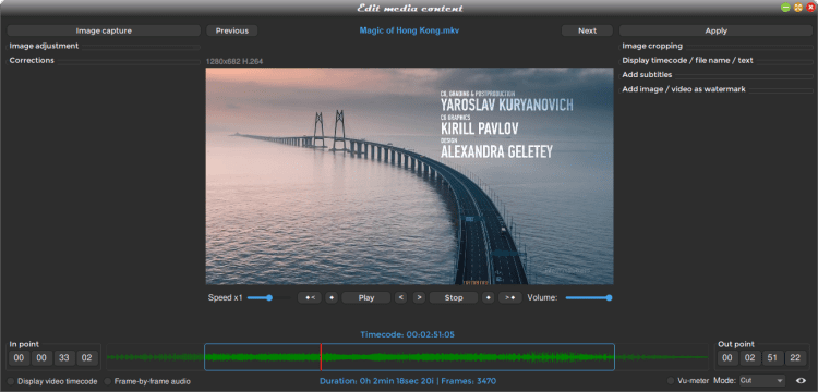 - поддержка кодеков DNxHD, DNxHR, Apple ProRes, QT Animation, GoPro CineForm, Uncompressed YUV, H.264, H.265, VP9, AV1, OGV, XDCAM HD422, AVC-Intra 100, XAVC, HAP, DV PAL, MJPEG, Xvid, WMV, MPEG;