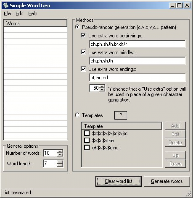 Simple Word Gen - это программа, которая предназначена для построения списка случайных слов на основе схемы "согласные, гласные, согласные".
